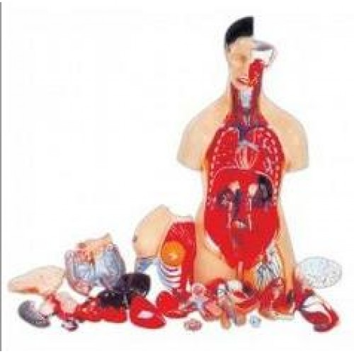 Dissectable into 19 parts. Torso, Head is detachable which separates into 2 parts and the left side brain is removable, Lungs (4 parts), Heart, Trachea, Esophagus and Descending Aorta, Diaphragm, Stomach, Duodenum with Pancreas and Spleen, Intestines, Kidney, Liver and Bladder (2 parts), Breast plate.